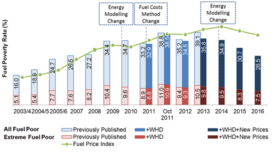 - Almost two thirds (2.7 percentage points) of the reduction in fuel poverty rates between 2015 and 2016 can be attributed to the lower price of domestic fuels. Around a third (1.5 points) can be attributed to improvements in the energy efficiency performance of the housing stock over this period and the rest (0.1 points) can be explained by higher household incomes.