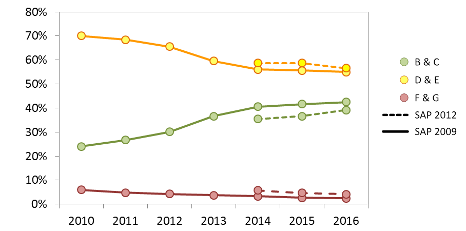 - Using SAP 2009 shows strong improvement in the energy efficiency profile of housing. The share of the most energy efficient dwellings (rated C or better) increased from 24% in 2010 to 43% in 2016. In the same period, the proportion of properties in the lowest EPC bands (E, F or G) almost halved, reducing from 27% to 14%.