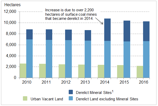These annual changes have combined to show a cumulative increase of 1,064 hectares (9 per cent) in the total amount of derelict and urban vacant land recorded since 2010, from 11,372 hectares in 2010 to 12,435 hectares in 2016. However when excluding derelict mineral sites there has been a cumulative decrease of 741 hectares (8%) in the total amount of derelict and urban vacant land since 2010.