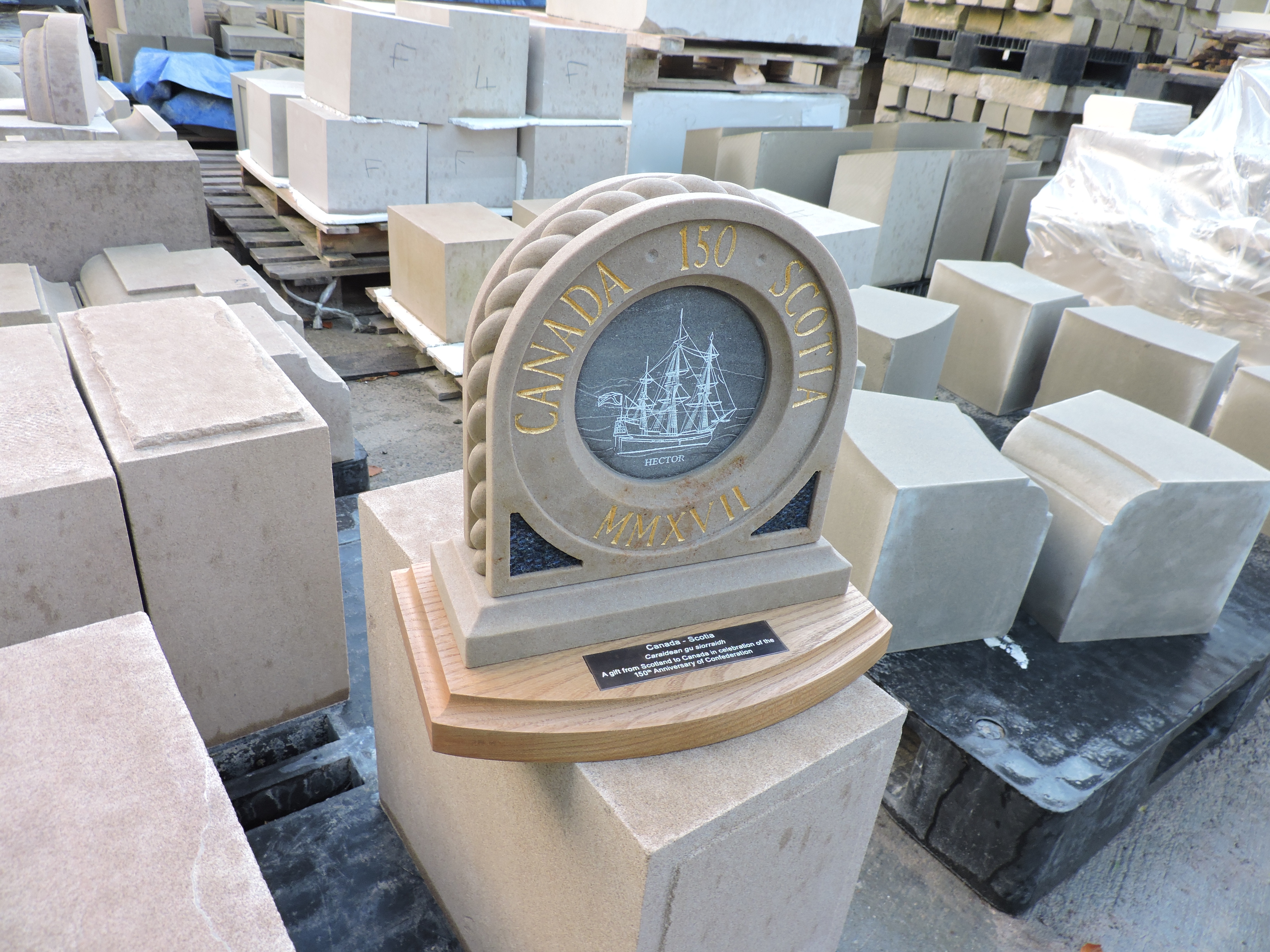 - The design of the sculpture uses Highland Clashach stone from their Elgin quarry. A rock from the shores of Loch Broom was hand selected, then polished and inset as the central focal point with an etched image of the Hector. This ancient rock would have been lying on the shore of Loch Broom when Hector set sail for Nova Scotia in 1773. The decorative stylised edge rope carving references both the Ship’s rigging and the strong physical and cultural bond that exists between Scotland and Canada. The Gaelic text on the plaque translates into “Forever Friends”. The timber base is made from a piece of recovered elm felled in the garden of The Palace of Holyroodhouse, Edinburgh - Her Majesty’s official Royal residence in Scotland. These elms were planted under the instruction of Prince Albert around 150 years ago.