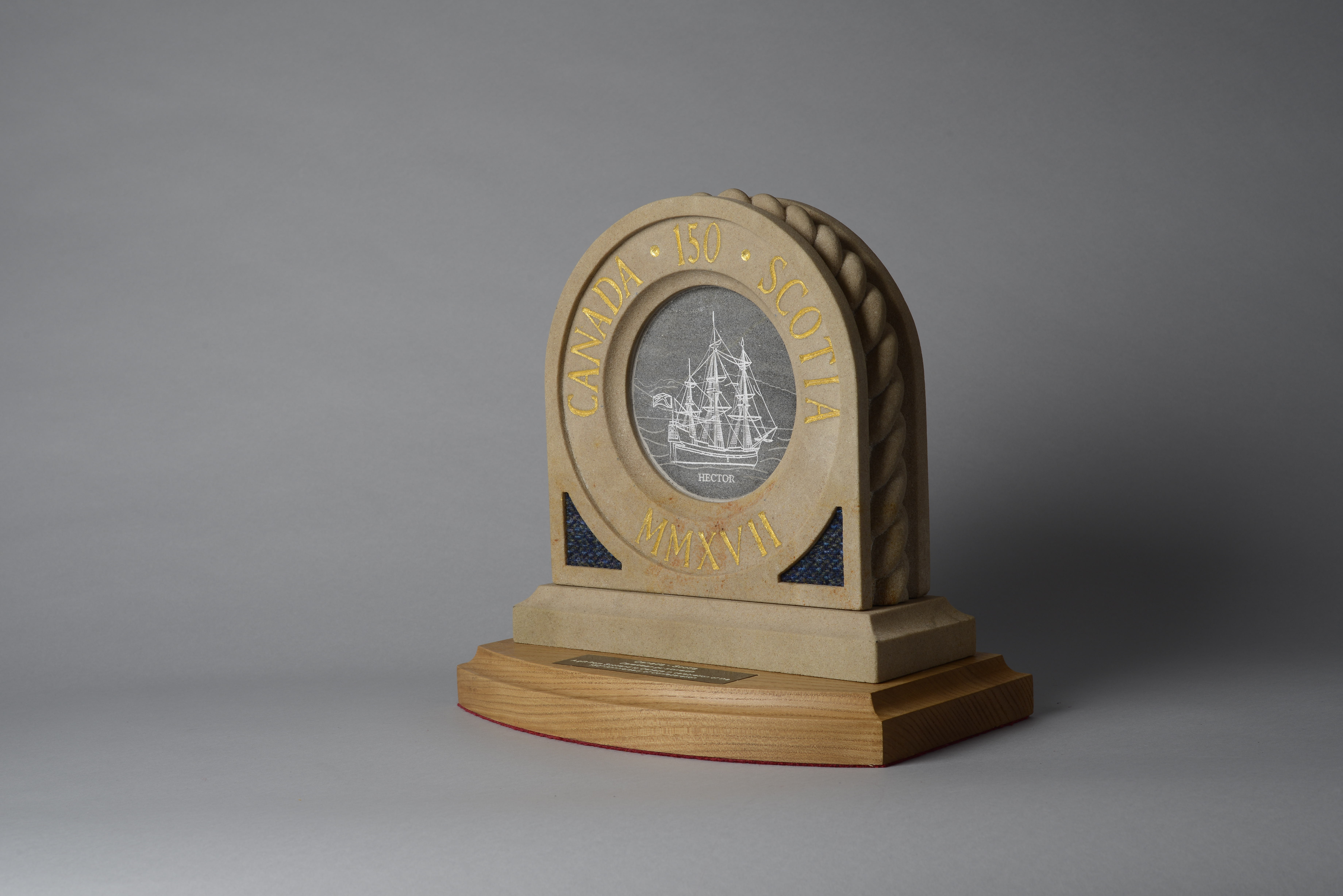 Crafted from a stone from the shores of Loch Broom, where Hector set sail for Nova Scotia in 1773, the gold-leaf sculpture features an etching of the 18th century ship. The timber base is made from a piece of recovered elm felled in the garden of the Palace of Holyroodhouse. The Gaelic text on the plaque translates into “Forever Friends”.