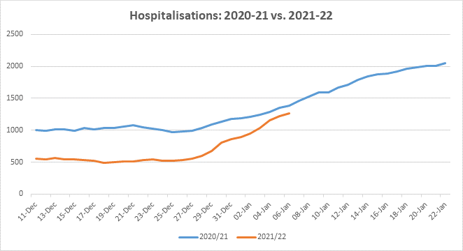 The NHS is having to cope with a significantly faster rate of increase in COVID hospitalisations this year compared to last January. Between Christmas Day and January 10th the number of patients in hospital with recently confirmed Covid increased by 905, 45% faster than over the same period last winter when it increased by 625.