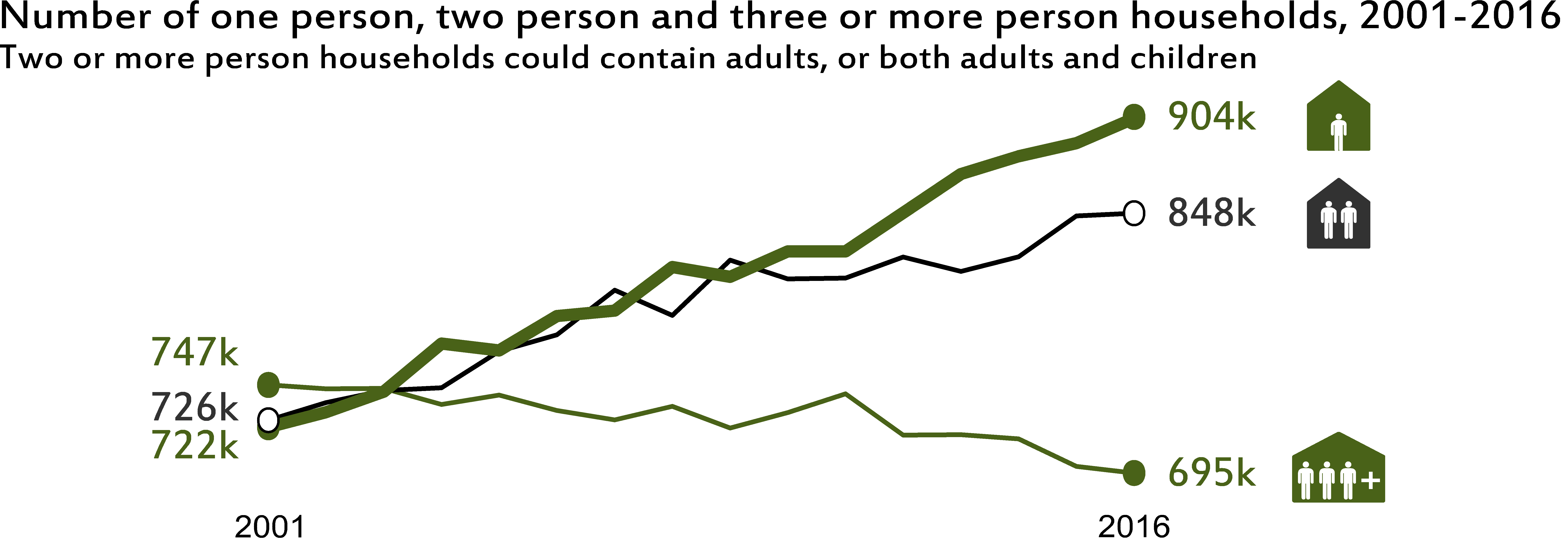 Over a third of households are single person households, and just over 900,000 people are living alone (Scottish Household Survey 2016, figure below).