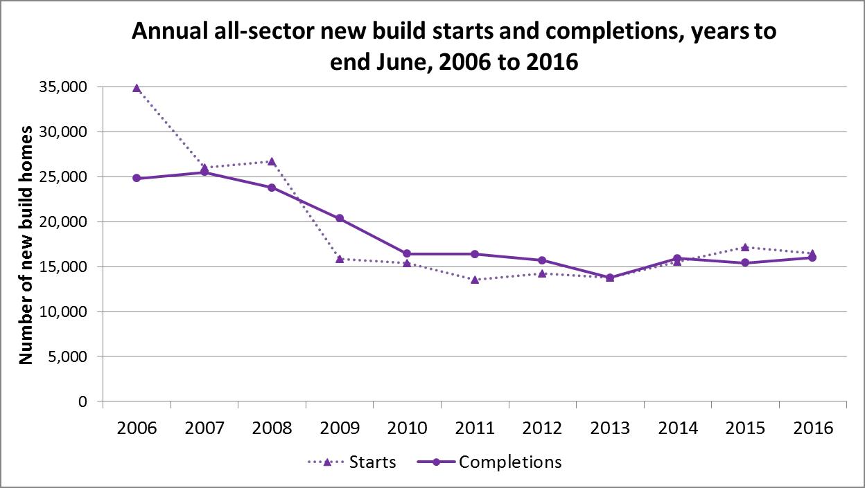 - More up-to-date figures show that, in July to September 2016, 832 social sector homes were completed (153 fewer than the 985 completions in the same quarter in 2015), and 1,282 were started (44% more than the same quarter in the previous year). This brings the total completions for the 12 months to end September 2016 to 3,693 (a 9% decrease on the 4,052 social sector homes completed in the previous year). Total starts over the 12 months to end September 2016 are now at 5,030 (23% more than the 4,089 started in the previous year).