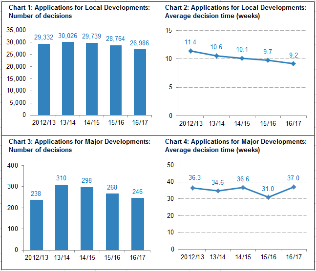 Major Development decisions were slower in 2016/17. The average decision time for Major Developments (246 applications) in 2016/17 was 37.0 weeks, six weeks slower than the average of 31.0 weeks in the previous year and the slowest annual figure since the start of this data collection in 2012/13. Major housing applications were decided in an average of 44.9 weeks, more than four weeks slower than the previous year (40.6 weeks).