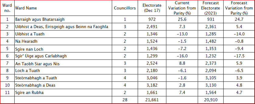 The proposals for public consultation in Na h-Eileanan an Iar recommend 28 councillors, three fewer than at present, across 11 wards, an increase of two.