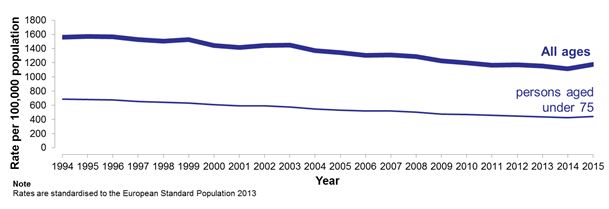 - Age-standardised death rates fell by 12 per cent between 2005 and 2015 for all ages and by 17 per cent for people aged under 75.