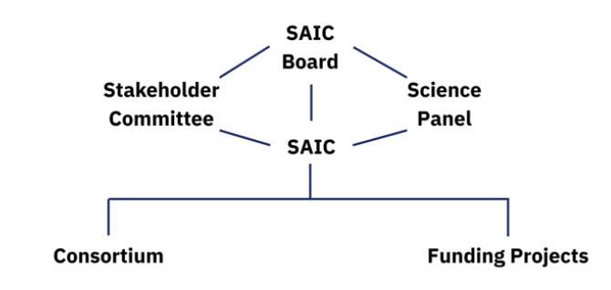 A simple organisational diagram showing the SAIC Board at the top centre. Two branches extend to the Stakeholder Committee on the left and the Science Panel on the right. A central line from the Board leads down to SAIC, which then branches further to the Consortium on the left and Funding Projects on the right.