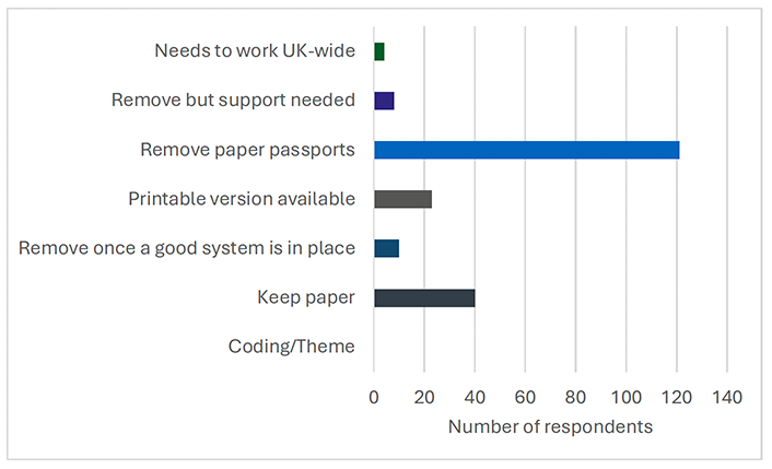 40 of the respondents who answered this question would prefer to keep paper passports and 4 respondents said that it is important that any changes work UK-wide.