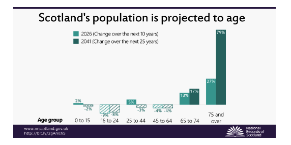 The number of people aged 75 and over is projected to increase by around a third of a million people over the 25 years to mid-2047, while the number of young adults aged 16 to 29 years is projected to decrease. In the first instance, this lowers the demand for school places and raises the demand for health and social care provision.