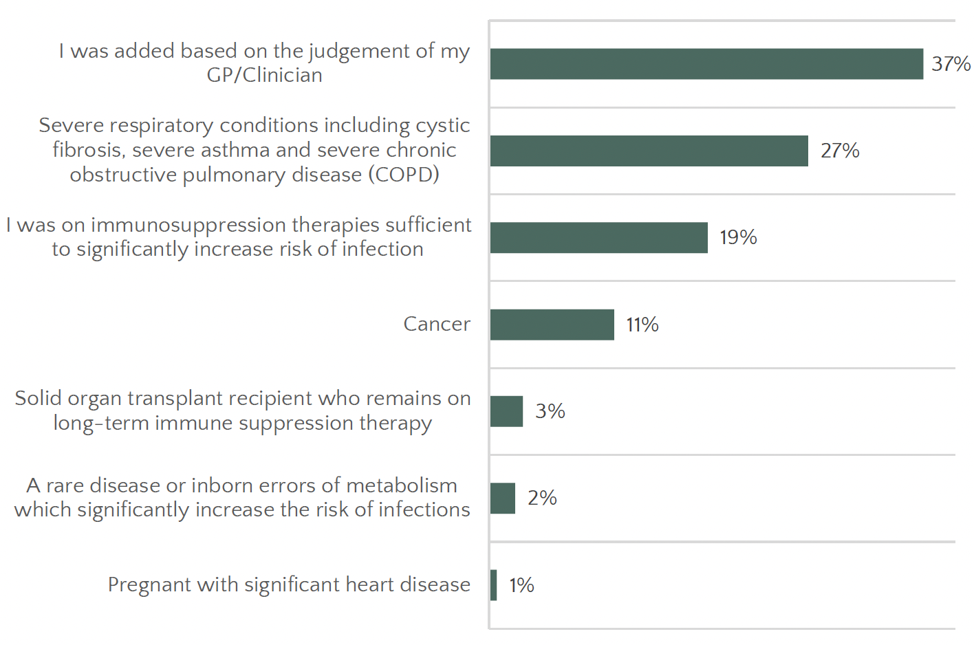 The main reason people were included in the shielding program was because their doctor or GP thought it was necessary (37%) (see Figure 2.2). Other reasons included severe respiratory conditions like cystic fibrosis, severe asthma, and severe chronic obstructive pulmonary disease (COPD) (27%), being on immunosuppression treatments that significantly increase the risk of infection (19%) and having cancer (11%). A small percentage of people advised to shield were those who had received solid organ transplants and were on long-term immunosuppression therapy (3%), as well as individuals with rare diseases or inborn errors of metabolism that significantly increased their risk of infections (2%).