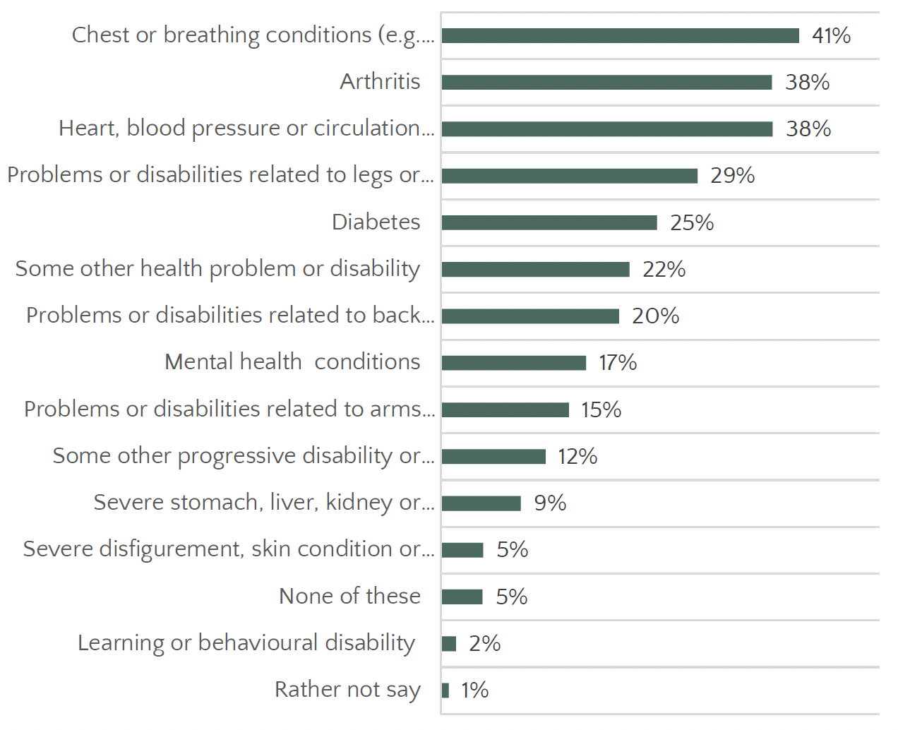 The three most commonly reported health conditions are chest or breathing conditions (41%), arthritis (38%) and heart, blood pressure or circulation (38%) the full breakdown can be seen in Figure 2.4.
