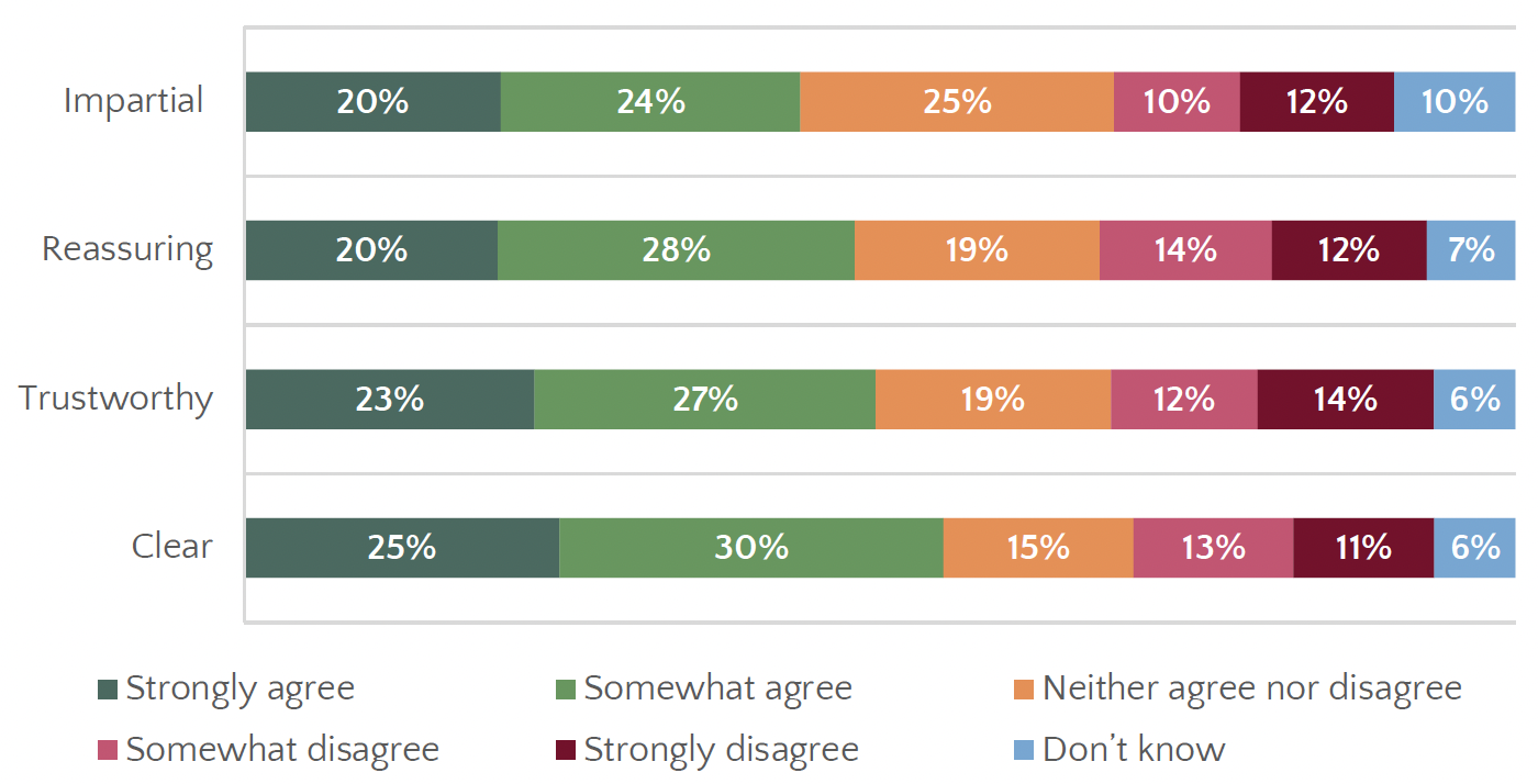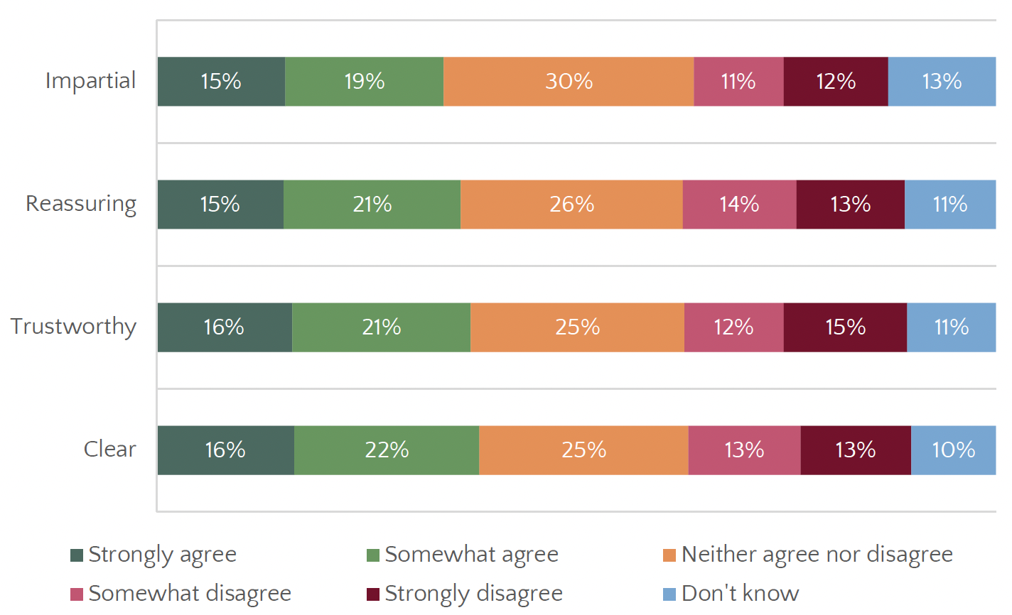 When considering guidance issued since the end of the Highest Risk List, survey participants expressed varying degrees of agreement across four key dimensions: clarity, trustworthiness, reassurance, and impartiality, see Figure 5.2:
