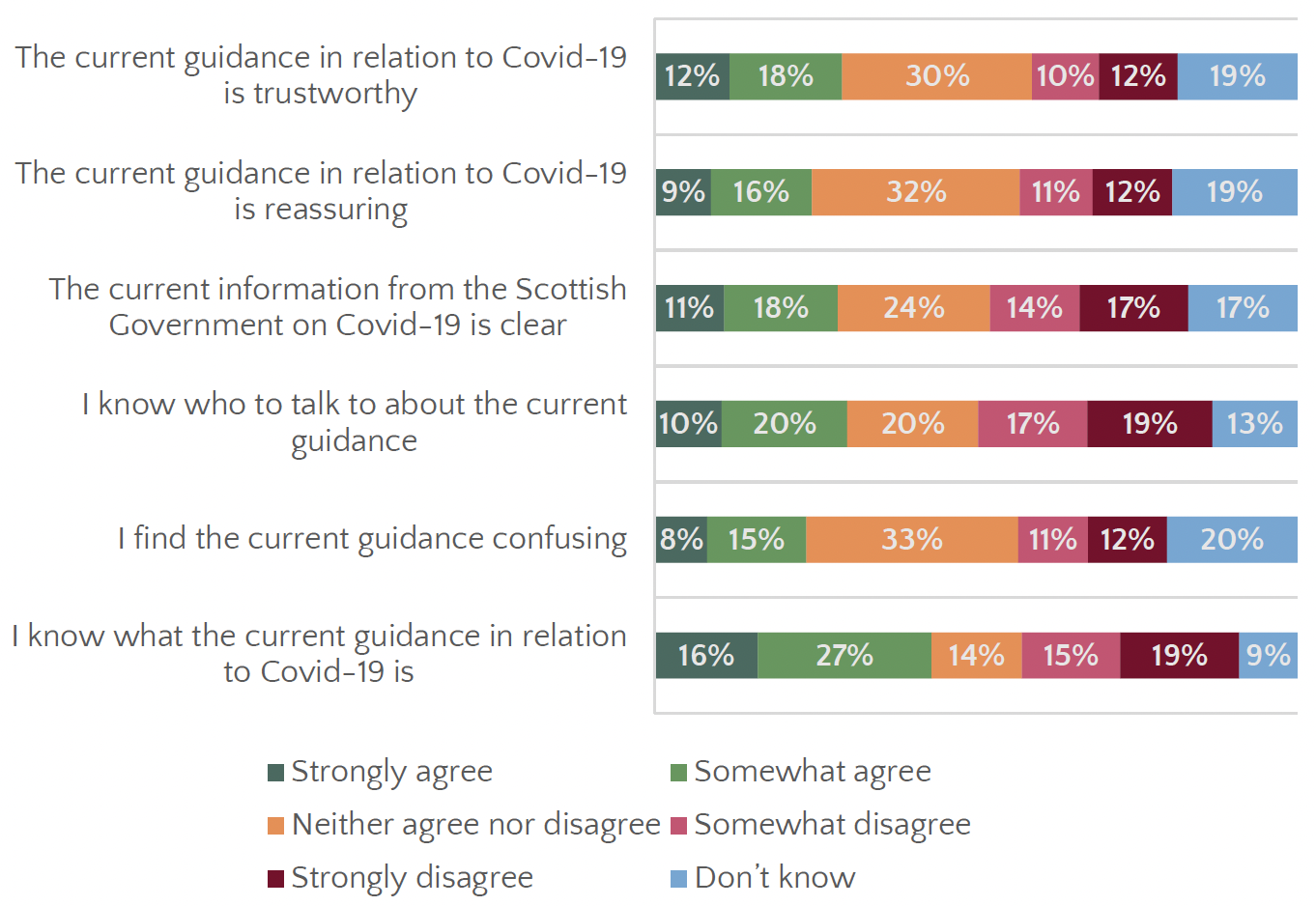 The survey delved into public perceptions of the current Covid-19 guidance provided by the Scottish Government, exploring various aspects of understanding and trust painting a mixed picture (see figure 5.3):