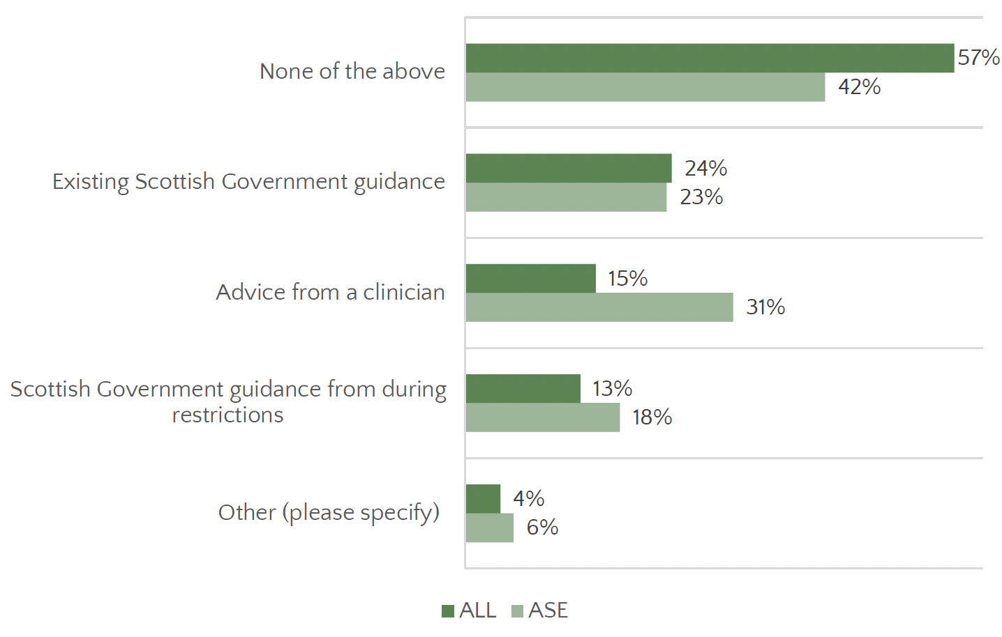 Among all respondents, 24% relied on existing Scottish Government guidance, 15% considered advice from a clinician and 13% took into account the Scottish Government guidance from the period when the HRL was in operation,