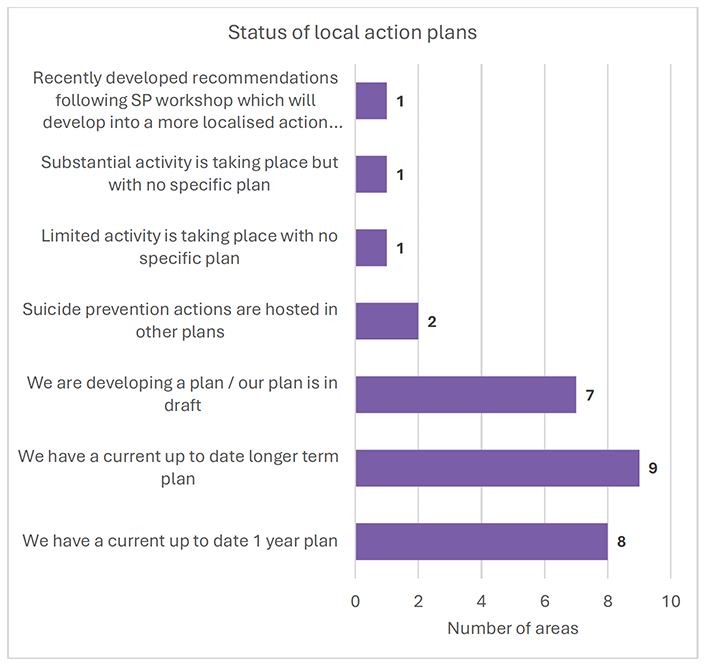 Leads were asked about the status of their local suicide prevention action plan (see figure 1). Seventeen leads indicated they had a current plan which was specifically focused on suicide prevention, these included plans which covered more than one local authority area. The remaining responses all identified that a plan was in development, embedded in other wider topic action plans or that activity was underway without a firm plan in place. This compared to the previous year when 8 areas had a current plan or one awaiting publication, and 7 had plans in development.