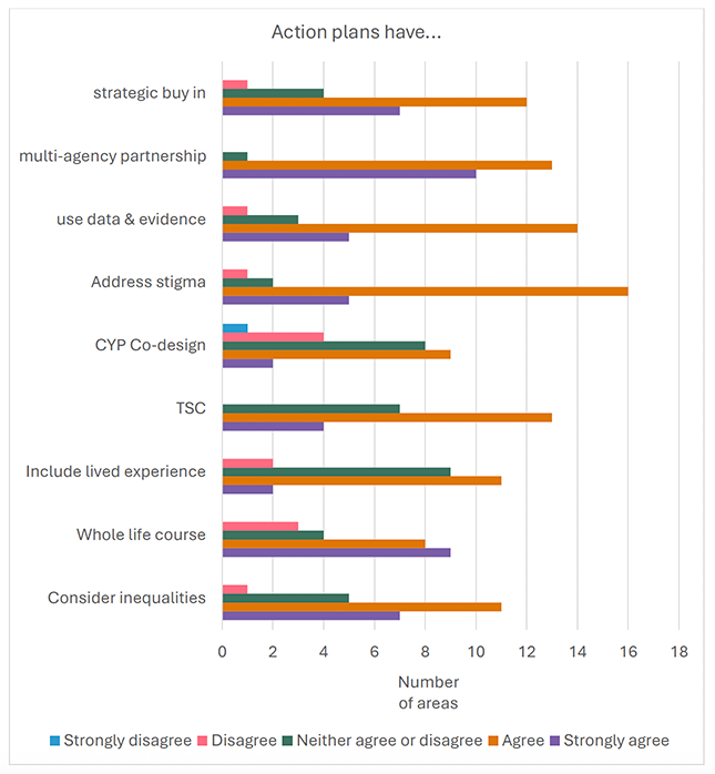 Local leads were also asked if their action plans reflected the Creating Hope Together guiding principles (see figure 2) and whether they were supported by local senior leadership as set out in the Creating Hope Together strategy.