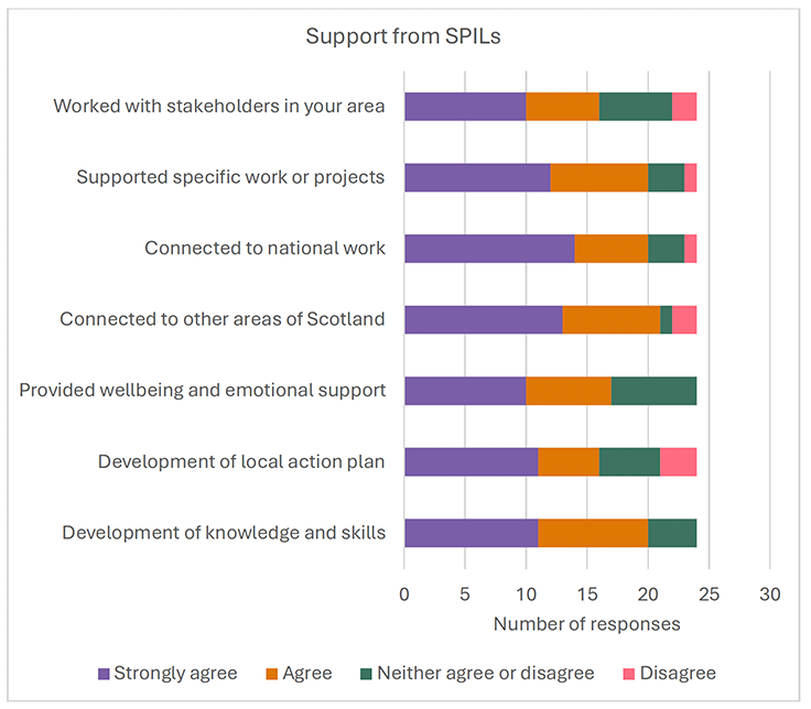The majority of leads either agreed or strongly agreed that the SPILs had been supportive across all the domains. This includes specific developments or actions in local areas and also ensuring connection for local leads into national areas of work.