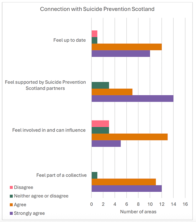 The majority of respondents also either agreed or strongly agreed that they felt connected and part of Suicide Prevention Scotland. Regular contact through national networks and local leads meetings are valued and updates from Suicide Prevention Scotland are appreciated, but the challenge of keeping up to date due to capacity was highlighted.