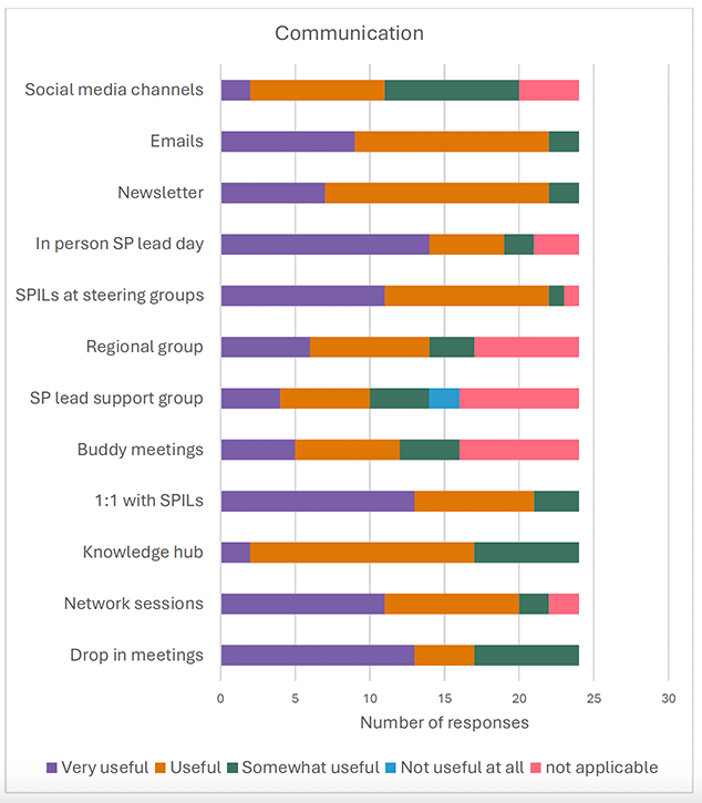 The local leads felt that some communication methods were more useful than others. Those that were felt to be most useful include emails, newsletters, network sessions and SPILs at 1:1 or steering group meetings. Social media channels were felt to be less useful for the local leads. Although feedback on support group for local leads and buddying, were also identified as being less useful, this is due to the small numbers who have taken part in these to date, for those who have been involved, these have been positive experiences and there is now a plan to extend the reach of these to make them available to all.