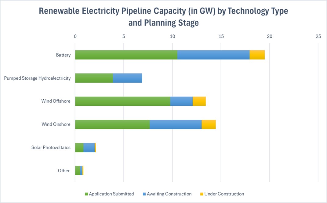Storage technologies in the form of batteries and pumped hydro storage have the largest estimated pipeline capacity (26.4 GW). This is then followed by onshore wind (14.5 GW) and offshore wind (13.4 GW).