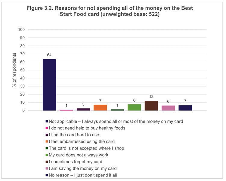 Survey respondents were asked about any reasons why they may not spend all the money on the BSF card and could choose as many as applied. Around two-thirds (64%) of respondents in receipt of BSF said they always spent all or most of the money on their payment card.