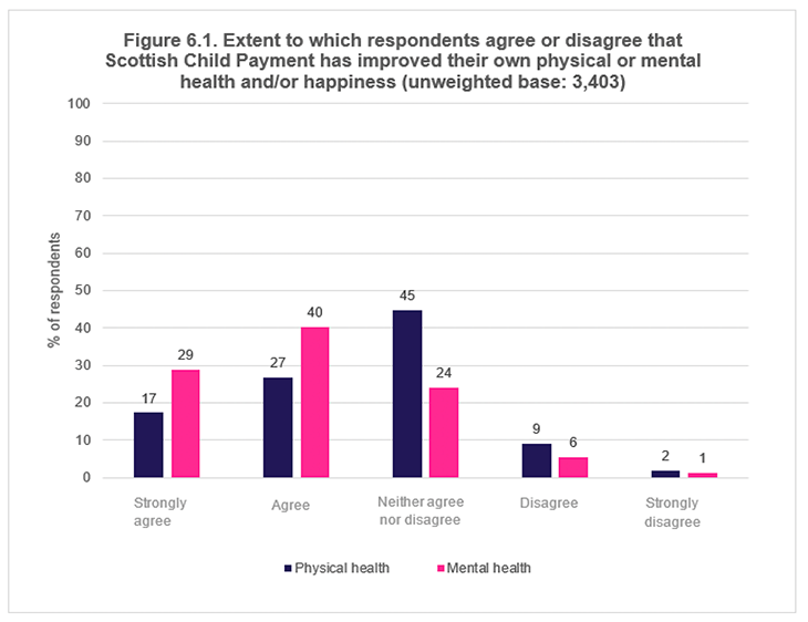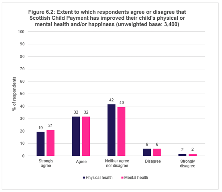 Survey respondents were asked about the extent to which the Scottish Child Payment (SCP) had improved their physical health and mental health and/or happiness, and the physical health and mental health and/or happiness of their child or children.