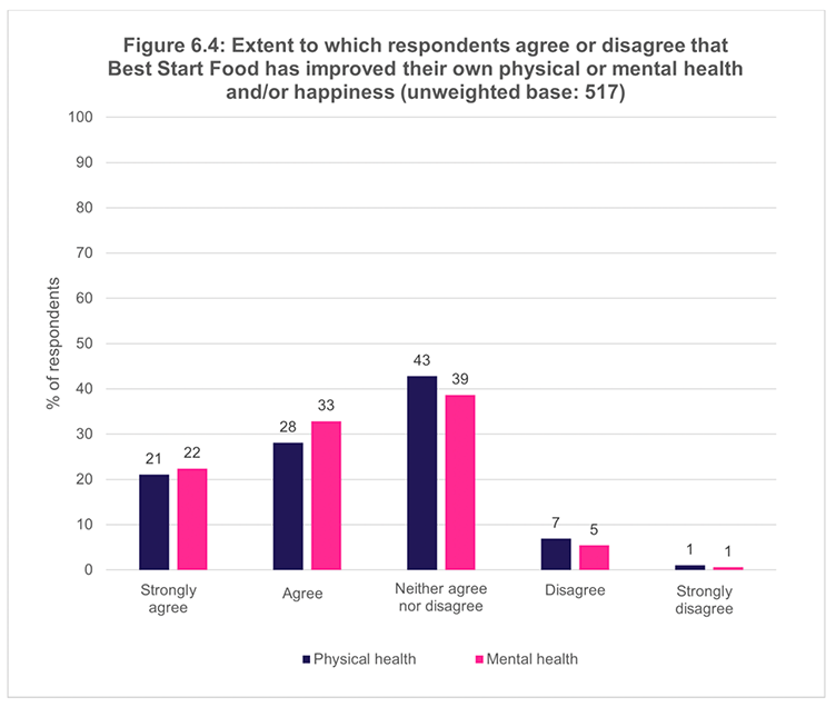 When survey respondents were asked about the extent of the impact of the BSG payments on the physical and mental health and/or happiness of their child or children, around half (49%) ‘agreed’ or ‘strongly agreed’ that BSG had improved their child’s mental health and/or happiness.