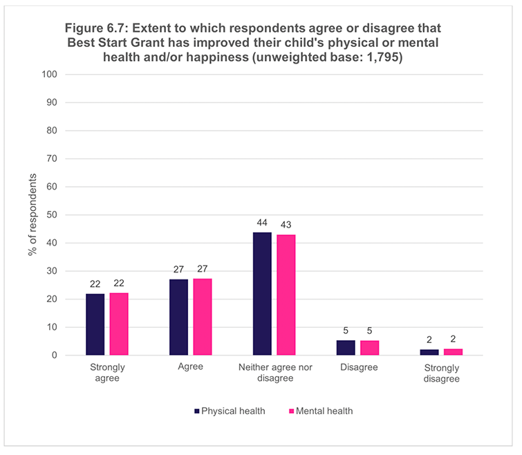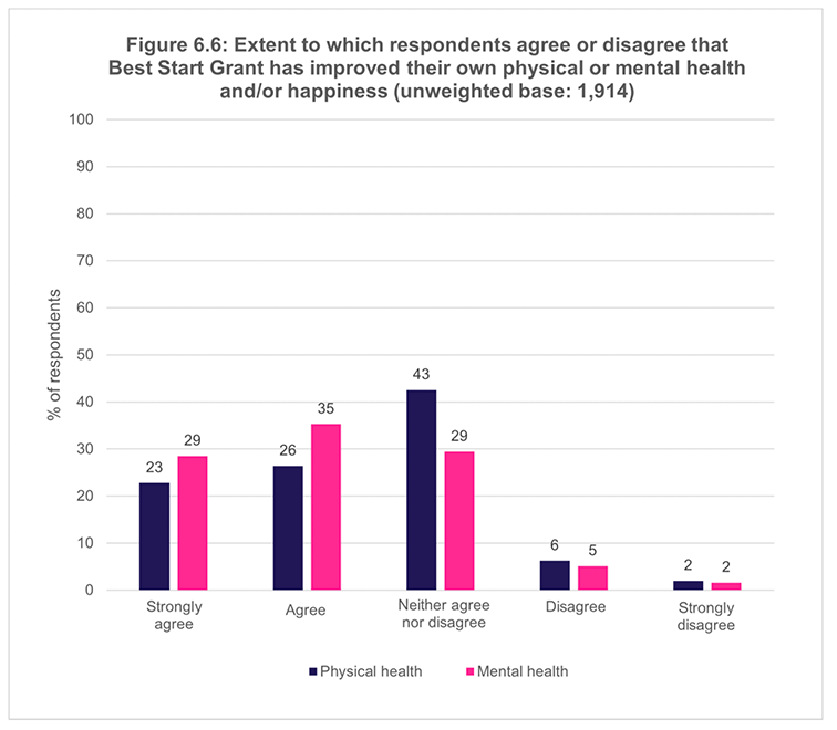 Survey respondents in receipt of BSG were asked about the extent to which Best Start Grant payments had improved their own physical health and mental health and/or happiness, and the physical health and mental health and/or happiness of their child or children.