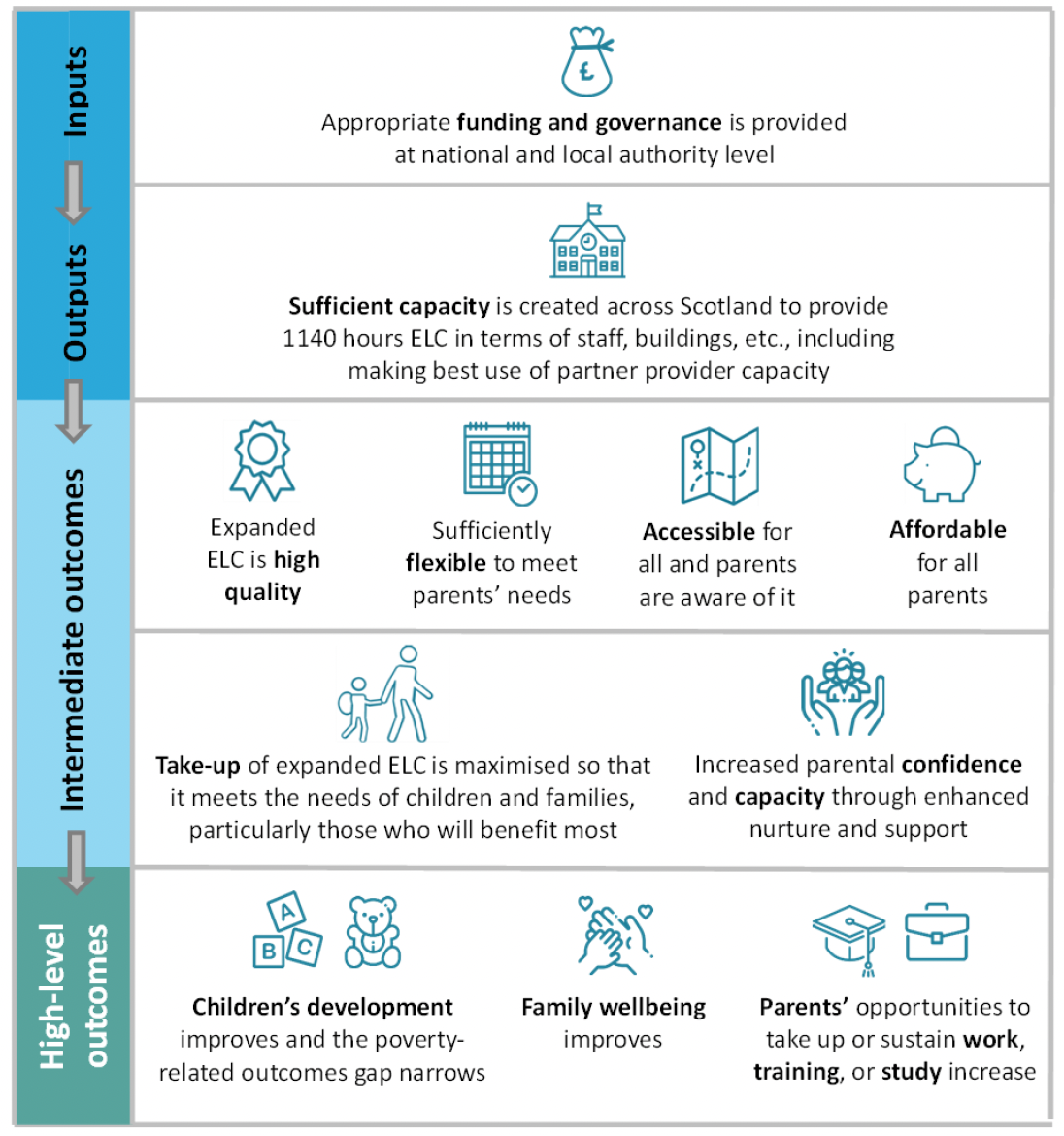 The ELC expansion simplified logic model (see Figure 1) sets out the programme’s intended intermediate and high-level outcomes. These outcomes were initially set out in an Evaluability Assessment of the ELC expansion (McAdams et al., 2017). The outcomes were refined and articulated during the development of the Scottish Government’s Strategic early learning and school age childcare plan (2022b), alongside which an evaluation strategy was published (see Section 1.4).