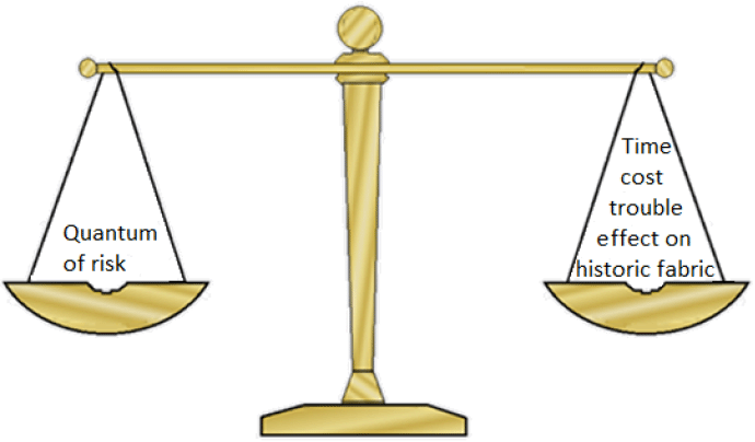 Reference is made in the Technical Handbooks to the term reasonably practicable, which in relation to the carrying out of any work, means reasonably practicable having regard to all the circumstances including the expense involved in carrying out the work. This was considered in the court case Edwards v National Coal Board 19497 when the judge reasoned that ‘reasonably practicable’ was a narrower term than ‘physically possible’, and implied that a computation must be made in which the degree of risk was placed in one scale and the sacrifice involved in the measures necessary for averting the risk (whether in money, time or trouble) was placed in the other. Any effect on historic fabric should be included in the ‘trouble’ part of the balance. If there was a gross disproportion between them – the risk being insignificant in relation to the sacrifice – the onus on the owner was discharged”.