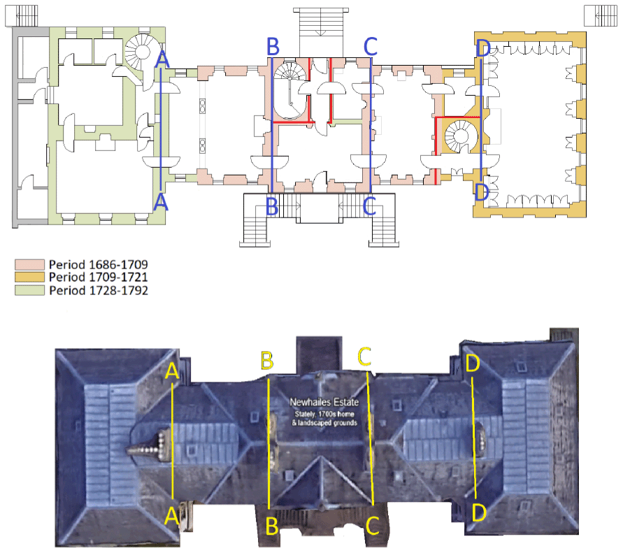 It can be seen from the satellite image (Illustration 2) that the original pitched and hipped roof has been overlaid at the time of extension with a new roof with a flat lead apex. The natural compartment lines A and D are formed by the new external walls of the extensions which contain chimneys rising through the roof covering. The red lines show protected zones which provide fire protection for the escape routes.