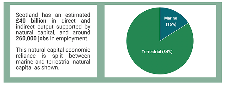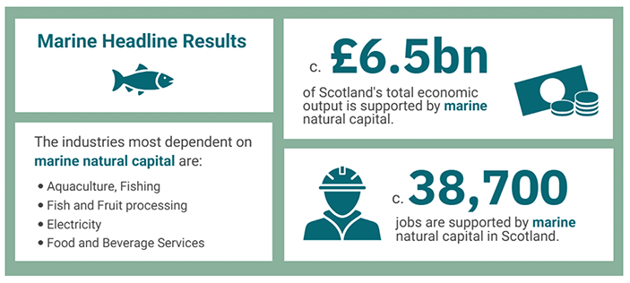 Out of the estimated £40 billion total direct and indirect output supported by natural capital in Scotland, at least 16% is estimated to be reliant on marine natural capital.