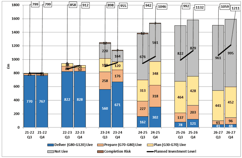 Live Investment is categorised by Plan (Gate 30-60), Prepare (Gate 70/80), Deliver (Gate 80 -120) and Non-live Investment, (Pre Gate 30). The “Deliver” category includes both projects which have been committed for delivery (post Gate 90) and those at detailed design stage but not yet committed. The data also includes allowance for risk associated with the potential additional cost increase of the SR15 Completion programme.