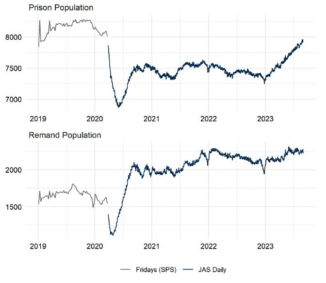 While the overall prison population continues to be lower than pre-pandemic levels, there has been a sustained increase in 2023 and the number of people held on remand remains at a historic high (see charts below).
