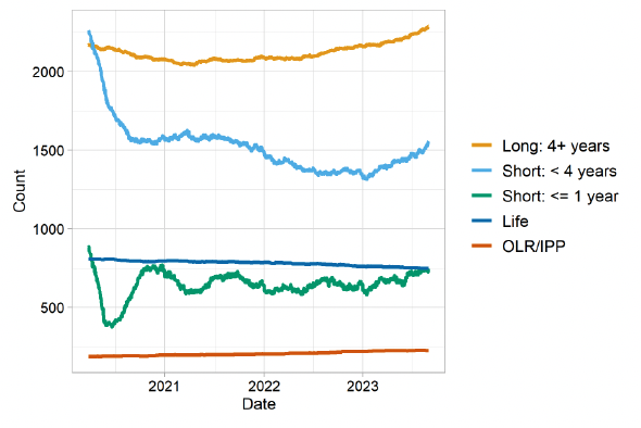 Change in the sentenced prison population varies by sentence length, as shown in the chart below. The populations serving short term overall sentences (less than 4 years) fell substantially and rapidly during 2020, whereas populations serving long term and indeterminate sentences remained at similar levels to pre-pandemic. The population serving life sentences has seen a small and gradual decline since 2020, which has continued in 2023. The population serving sentences of less than or equal to one year increased in the first months of 2023; that population has started to fall more recently. The population serving sentences of one to four years has increased during 2023. Populations serving overall sentences of more than four years, as well as those serving Orders of Lifelong Restriction, have seen continuous increases over a longer period and now exceed pre-pandemic levels.