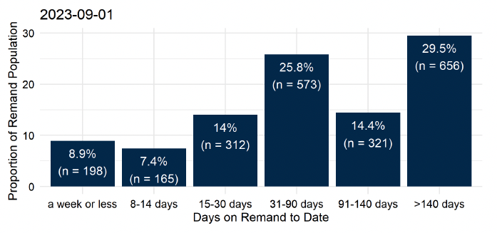 Note: The remand population includes individuals whose trial has commenced but not concluded, as well as those awaiting commencement of a trial. As a result, the figures referenced above reflect only that an individual has held the same status for an extended period, but do not reflect the relationship between these times on remand and the ongoing court procedure(s) to which they relate.