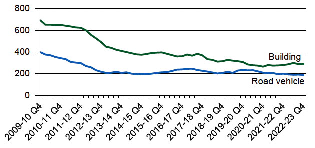 There were 233 deliberate building fires in quarter 4 of 2022-23, up from 224 in the same quarter of 2021-22. Over the same period, the number of deliberate road vehicle fires fell from 197 to 179. There has been a long-term downward trend in deliberate building and deliberate road vehicle fires since this series began.