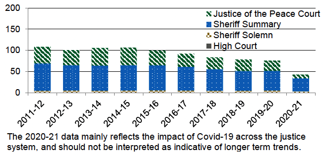 - COVID-19 impacted the number of proceedings and convictions in 2020-21. The number of people convicted in Scottish courts fell by 44% from 2019-20 to 42,532.