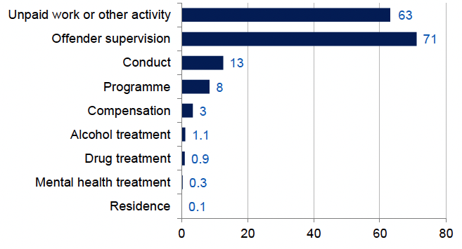 - Fall in numbers of community sentences issued, but rise in proportion in 2020-21.The number of community sentences in court fell by 42% between 2019-20 and 2020-21, from 16,661 to 9,741, in line with the fall seen in convictions overall due to the impact of COVID-19 on court business. The proportion of all convictions resulting in a community sentence rose to 23%, the highest in the past decade. The proportion split of sentence types this year is likely a function of the differing levels of capacity of the different court types operating during the year rather than indicative of any trend.