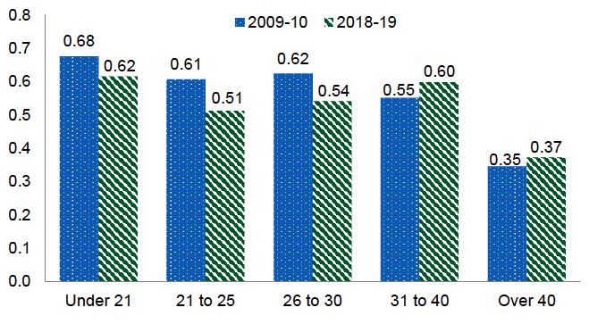 - Prior to COVID-19 affected data, the average number of reconvictions per offender has decreased over time. The average number of reconvictions per offender was 8% lower in 2018-19 compared to 2009-10. The fall in the longer term was driven by younger age groups, with average reconvictions decreasing by 9% for under 21s, 16% for 21-25 year olds, and 13% for 26-30 year olds. In contrast, average reconvictions increased for the older age groups over the decade, with increases of 9% for 31-40 year olds and 7% for those aged over 40.