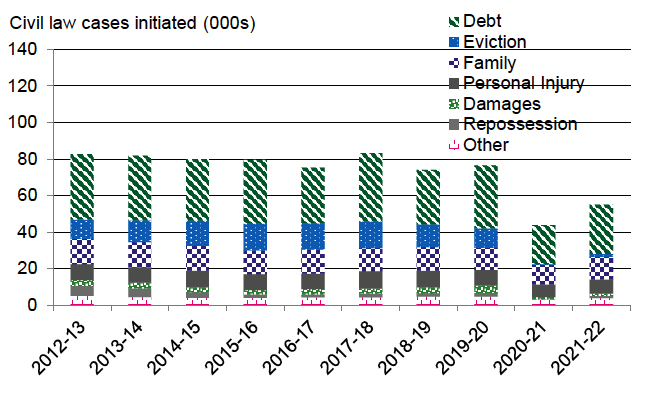 - Most case types increased since 2020-21, except damages which fell marginally. The highest increases were in repossessions (up 1,204%) and evictions (up 200%). The increase in repossessions follows a large Covid-related fall in 2020-21 to a record low. The increase in initiations in 2021-22 brings numbers closer to the pre-pandemic levels but still 46% lower than in 2019-20. Evictions too are still substantially lower than pre-pandemic levels (84% down on 2019-20). Personal injury (up 12%) and family (up by 17%) recorded the lowest increases. Damages saw a 4% decrease from 2020-21.
