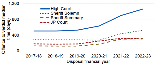 - The time associated with different parts of an accused person's journey in the justice system varies depending on the type of court their case is allocated. Median offence to registration time for accused persons in High court were around 21 months and median registration to verdict time were 11 months; offence to registration time in Sheriff solemn court were around 10 months compared to 4 months for registration to verdict. In contrast, for sheriff summary courts registration to verdict times are in general longer than offence to registration times - median offence to registration journey times were around 2 months compared to a median of about 6 months for registration to verdict.