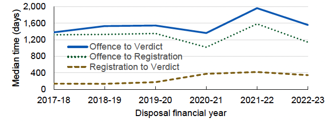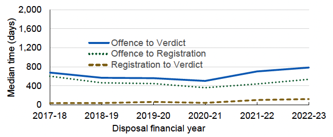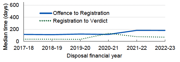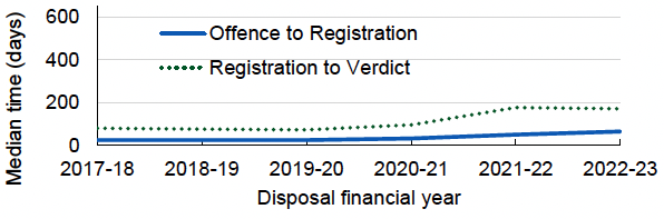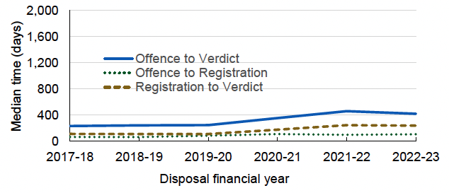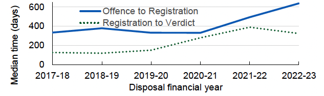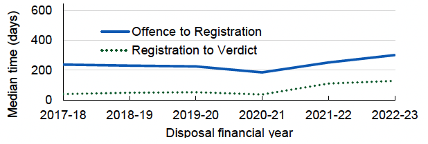 - Median journey times for accused prosecuted by courts (from offence date to verdict) increased post pandemic. Across all court types, median journey times of accused persons increased in 2021-22 (post pandemic) when compared to 2019-20 (pre pandemic). Furthermore, except for Justice of the Peace (JP) courts, all other court types saw an additional increase in median journey times over the latest financial year 2022-23. Median journey times for accused persons in solemn cases were longer than those for accused in summary cases.