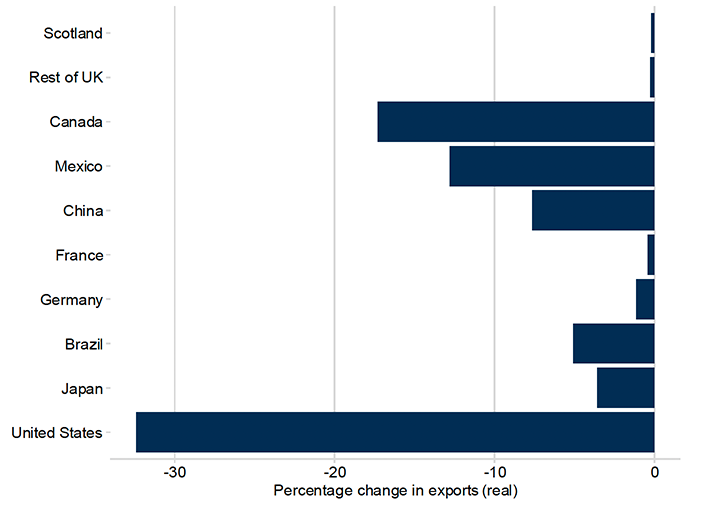 The model tells us how much larger or smaller trade flows would be in the long run, in the scenario of interest compared to the baseline trade flows in the input data. The results presented here are summarised from the raw outputs, showing how exports and output could be affected for Scotland, the rest of the UK, and other selected countries.