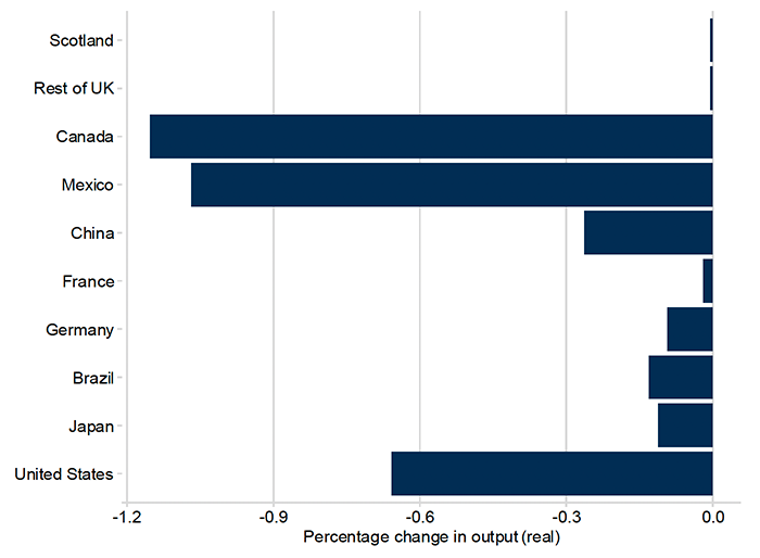 The model finds that, in the long run, total global trade could be 7% lower and global output could be 0.3% lower than if the tariff increases were not applied. Scotland and the rest of the UK are relatively less exposed than many other countries. Directly targeted countries (Canada, Mexico, China) tend to be hardest hit. The USA is also one of the worst affected countries. Figures 1 and 2 include retaliation by China and Canada, but even without this retaliation, the USA’s economy is damaged even by its own tariffs on others. This is consistent with economic theory: while tariffs can protect domestic industries, they can also disrupt supply chains and increase prices.