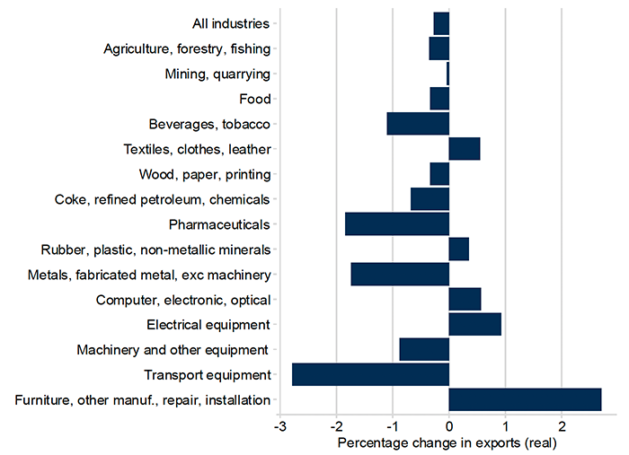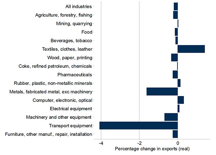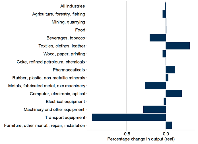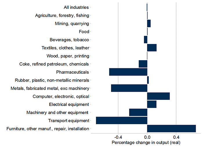 Output includes the total production in a sector: that is, exports plus domestic consumption. As such, it tends to show similar patterns to the export changes but on a smaller scale: all impacts here are less than 1%, and if we exclude transport equipment for the reasons given above, all impacts are well below 0.5%.