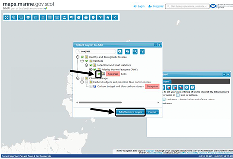 Navigate the layer folders or search with a keyword in the search bar (e.g. ‘Seagrass’). Tick the layers you would like to add and click ‘Add/Remove Layers’.