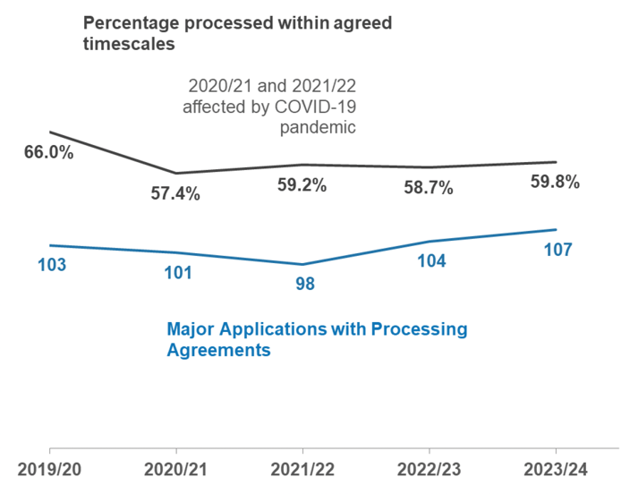 In 2023/24 there were 107 major development applications with processing agreements (an increase of 3 on the previous year). 59.8% of these met agreed timescales that had been set between developers and local authorities, slightly higher than the previous year (58.7%). Processing agreements are more likely to be used for major development applications than for local applications.