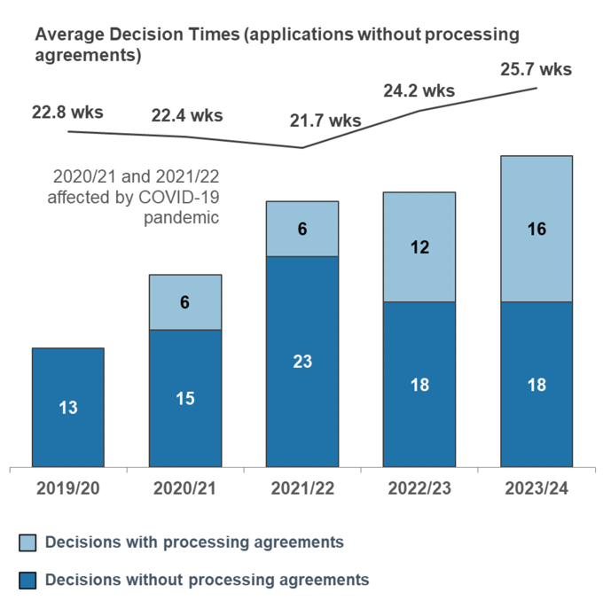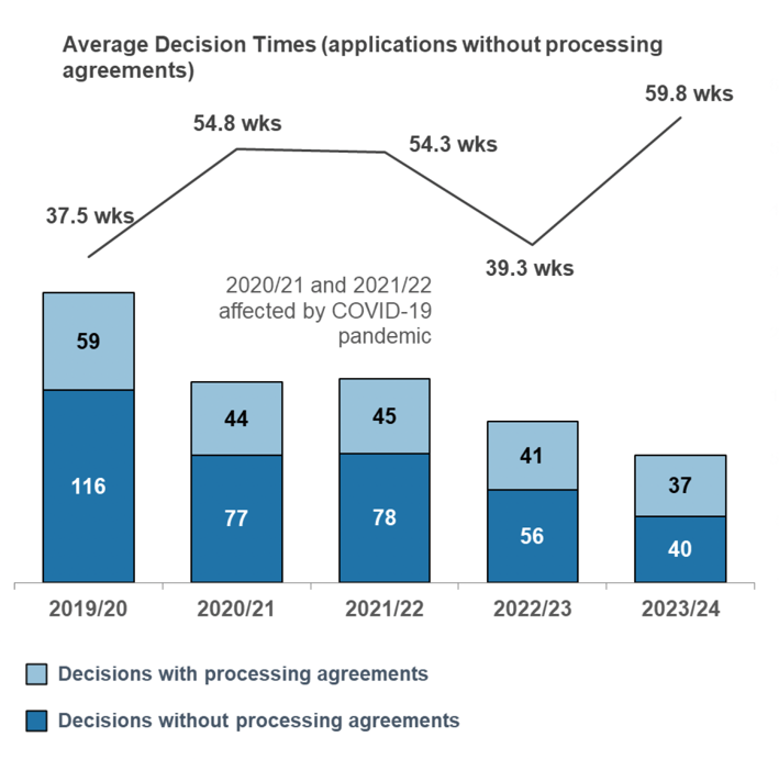 There were 34 major business and industry development applications determined in 2023/24 and increase of four in the previous year (30). Those not subject to processing agreements had an average decision time of 25.7 weeks. Average decision times for these applications have been fairly steady since 2019/20.